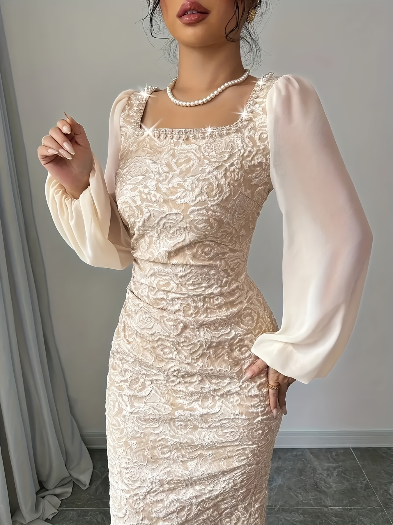 Elegant Long Sleeve Beaded Square Neck Dress - Chic Floral Pattern, High-Low Hem, Stretchy Polyester Blend, Perfect for Spring/Summer, Women'S Fashion, Cute Dress