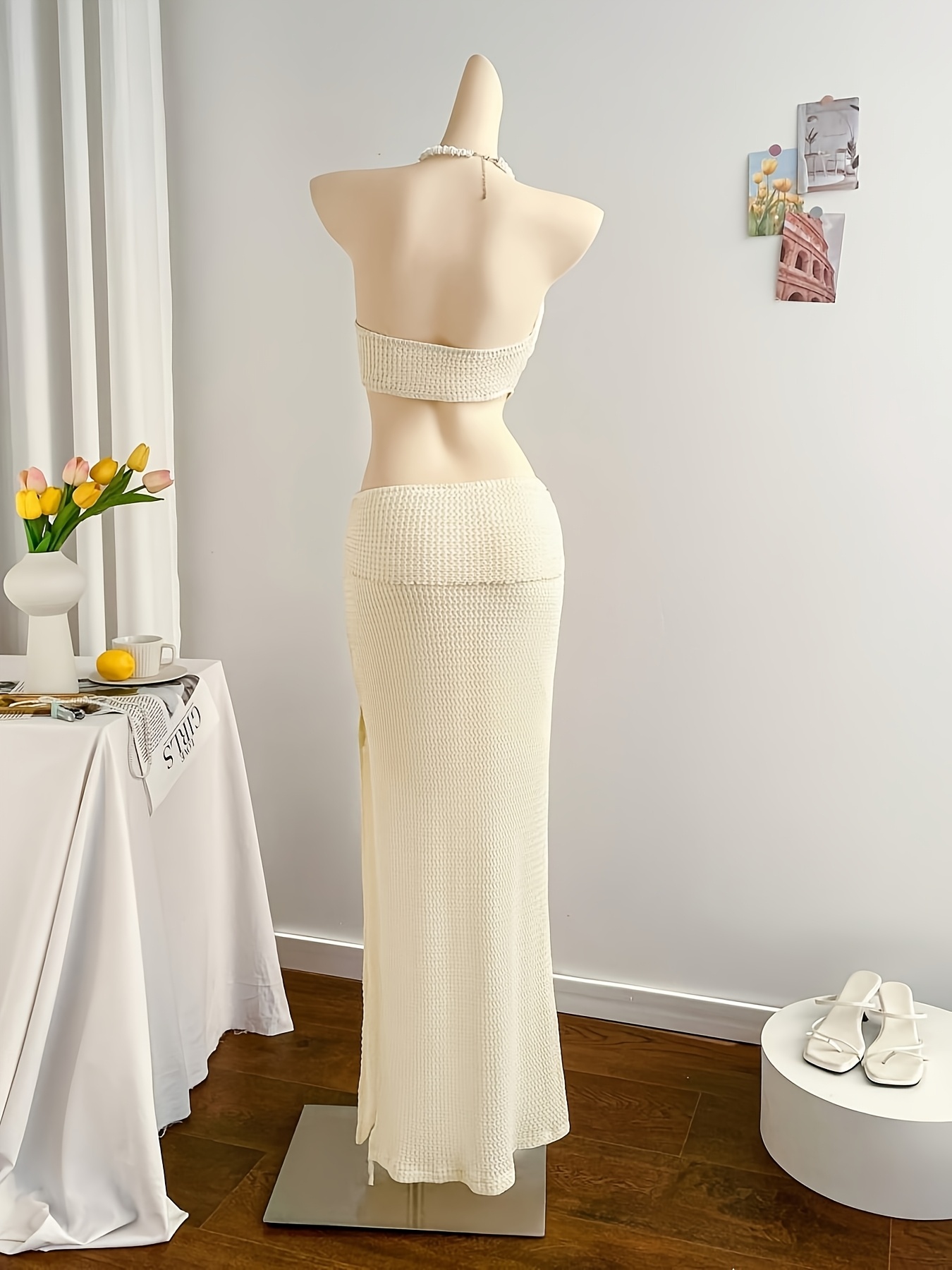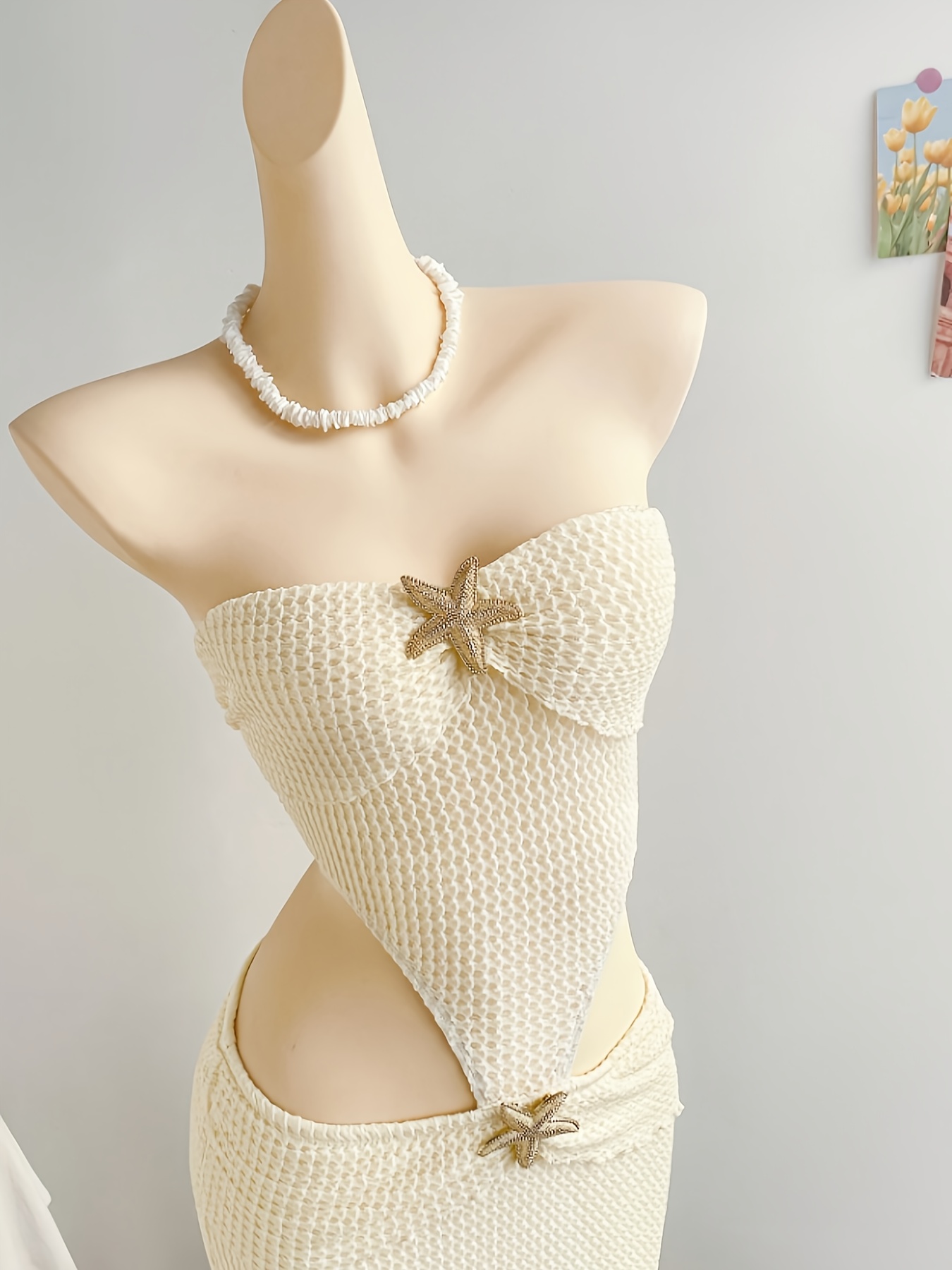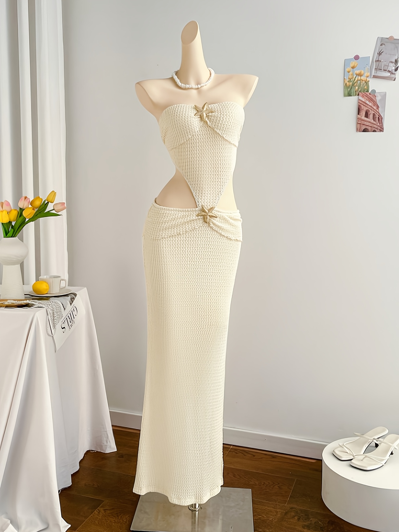 [Elegant Mermaid Dress] Elegant White Mermaid Dress | High-Waisted, Metallic Accent, Ruched Detailing - Perfect for Beach and Holiday Season