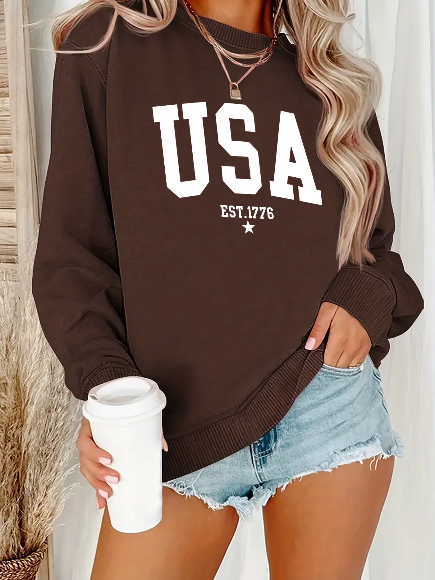 Plus Size Patriotic "USA" Graphic Red Sweatshirt - Casual Long Sleeve Crew Neck for Women - Machine Washable Polyester - Ideal for Fall & Winter, Patriotic Outfit|Casual Style|Smooth Texture, American Flag Clothes