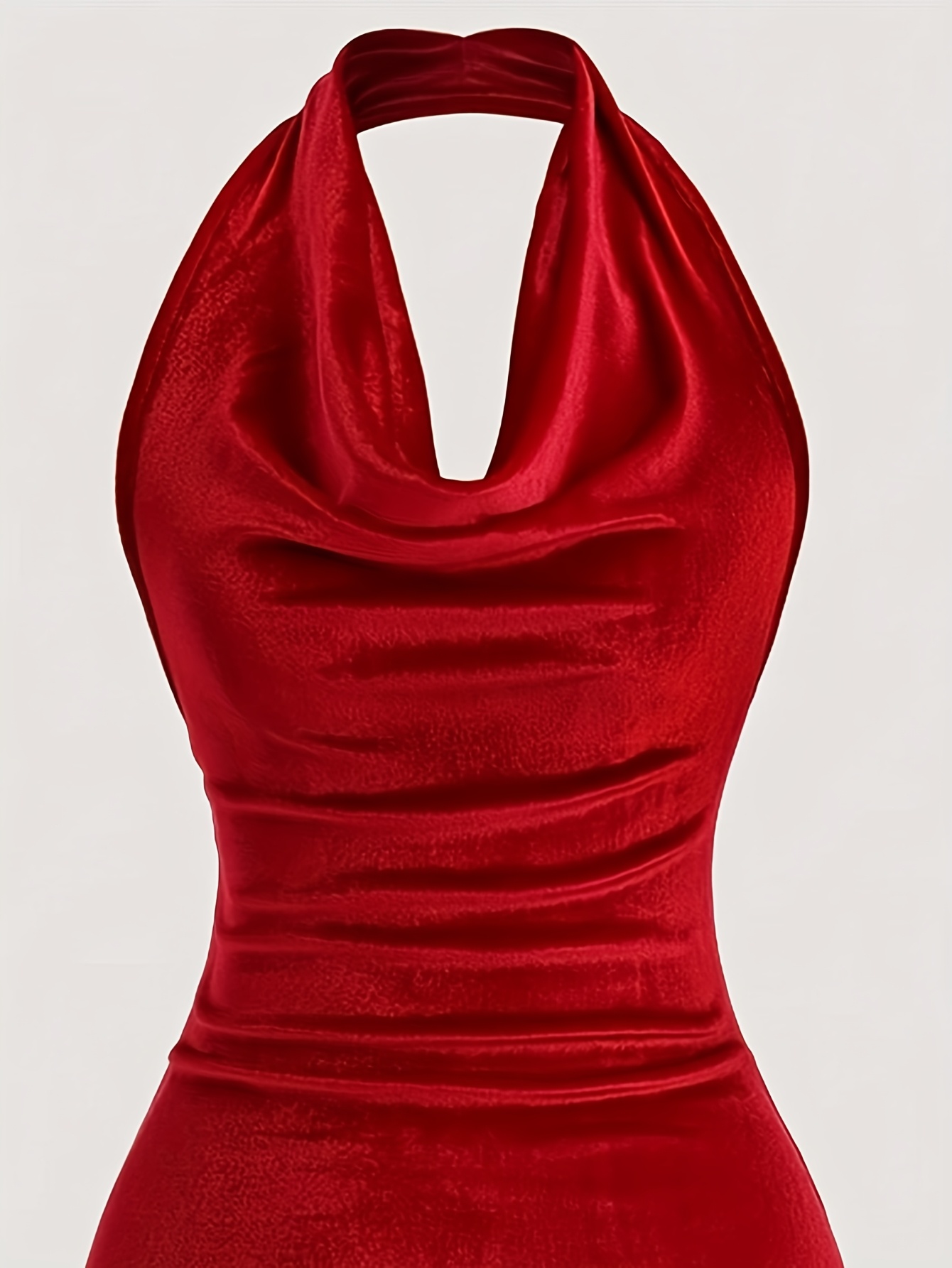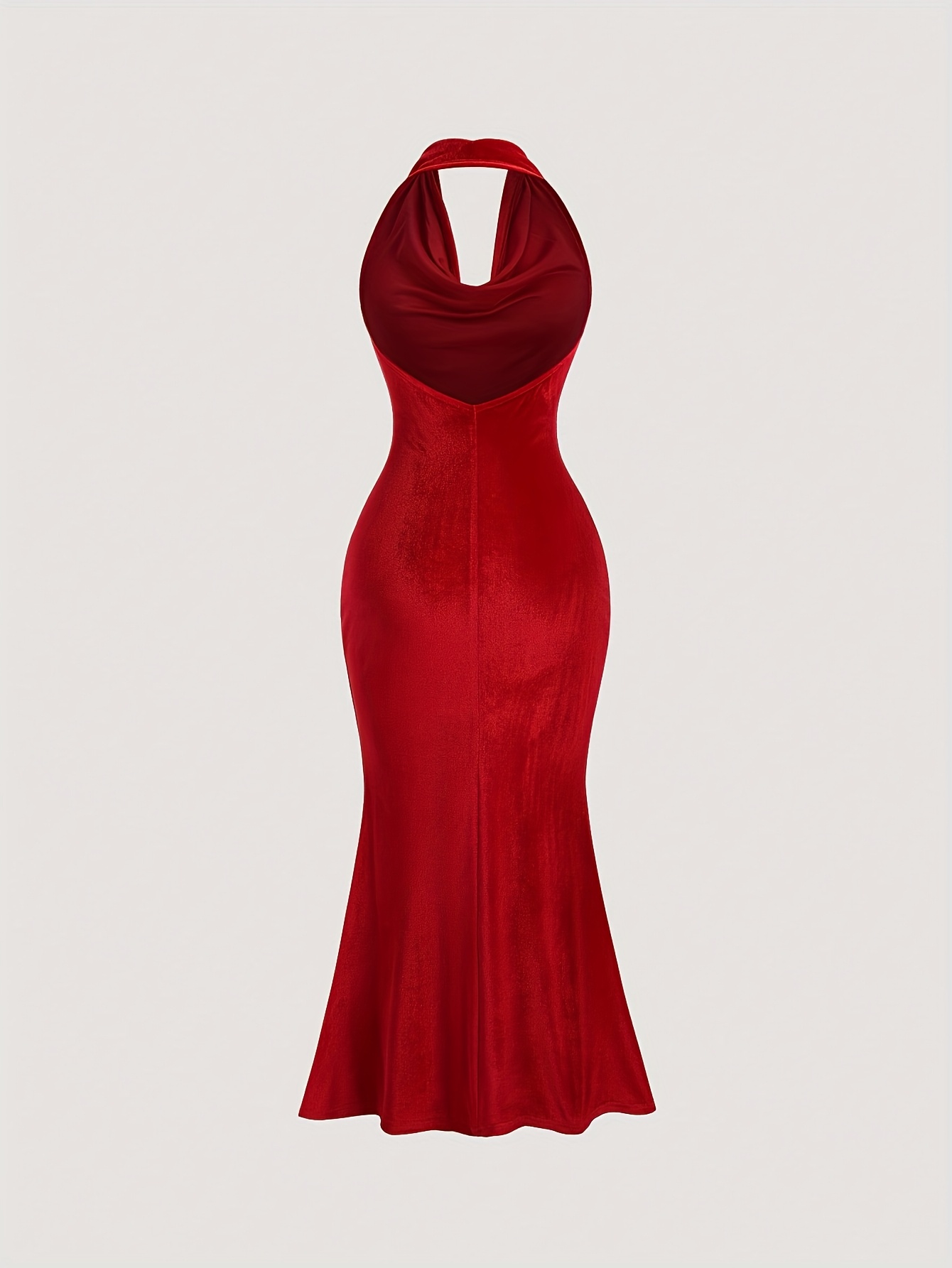 [Red Off-Shoulder Dress] Red Stretchy Off-Shoulder Mermaid Dress | Women's Elegant Bodycon Halter Neck | Polyester-Spandex Blend, Machine Washable Summer Party & Casual Outing Dress