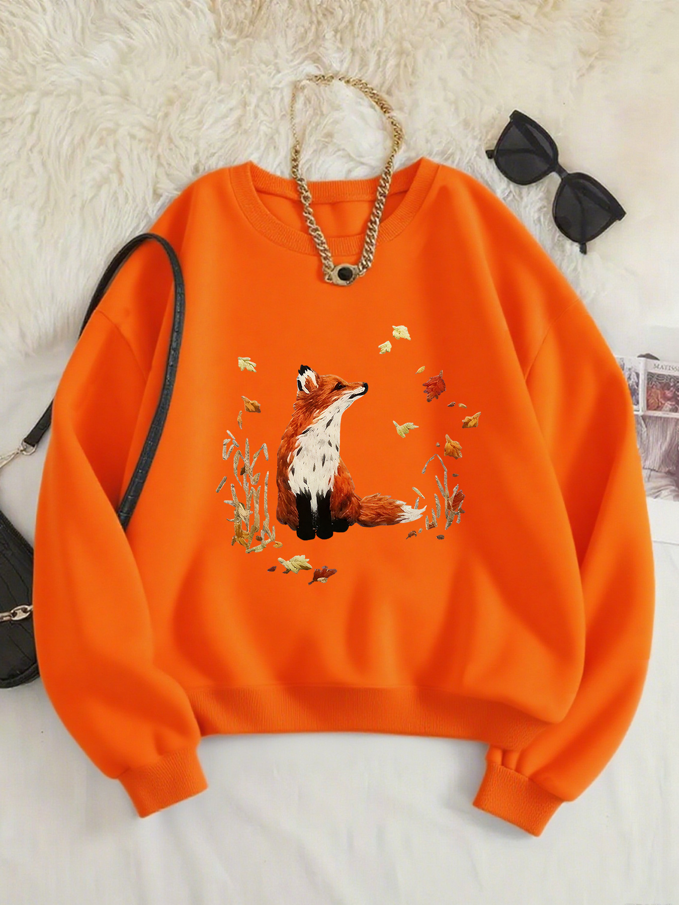 Women'S Cozy Crew Neck Sweatshirt with Vibrant Fox & Floral Print - Casual Long Sleeve Pullover for Fall & Winter, Soft Polyester Blend, Machine Washable, Allseason Apparel | Vibrant Print Top | Polyester Blend, Fox Sweatshirt