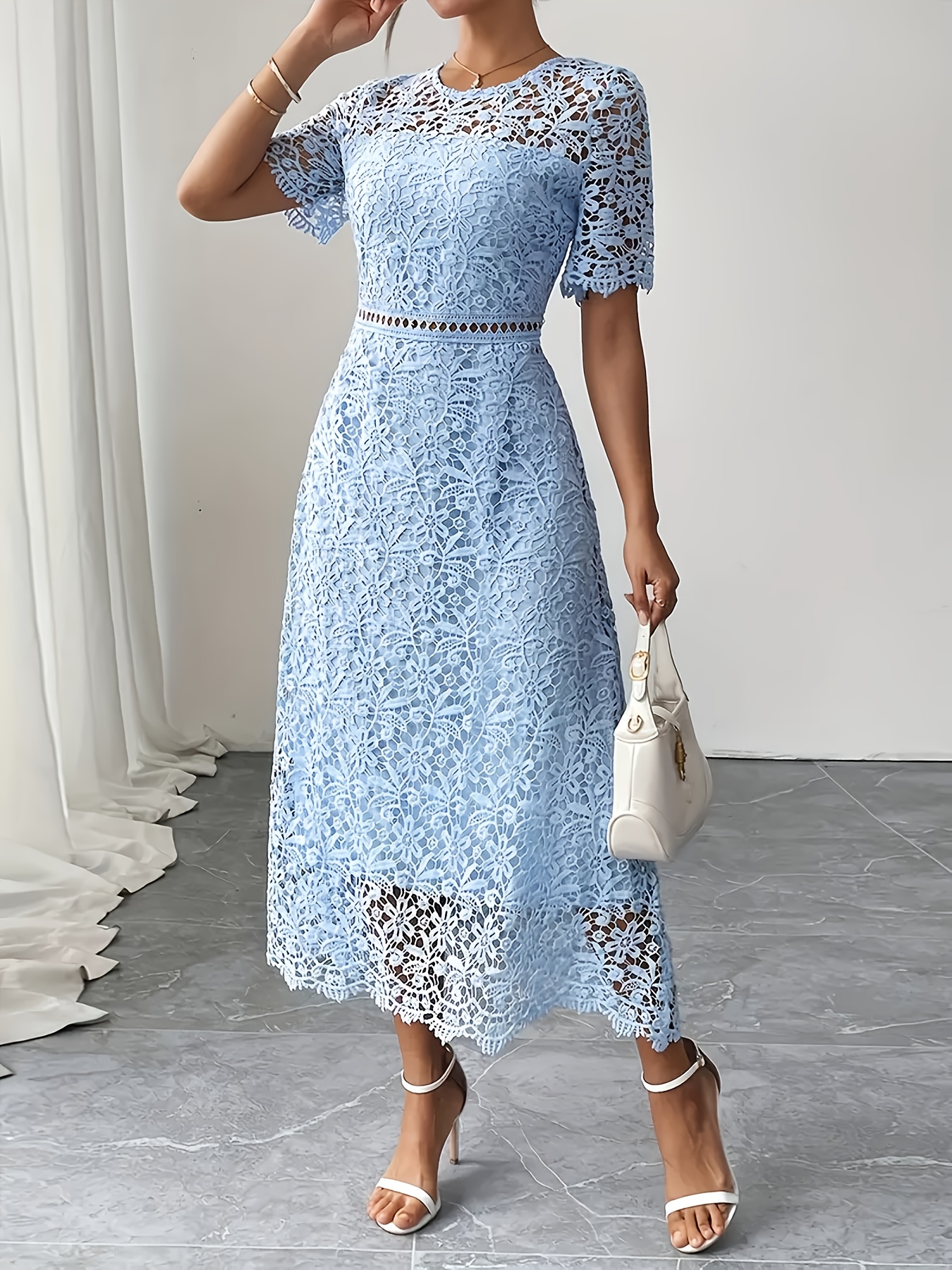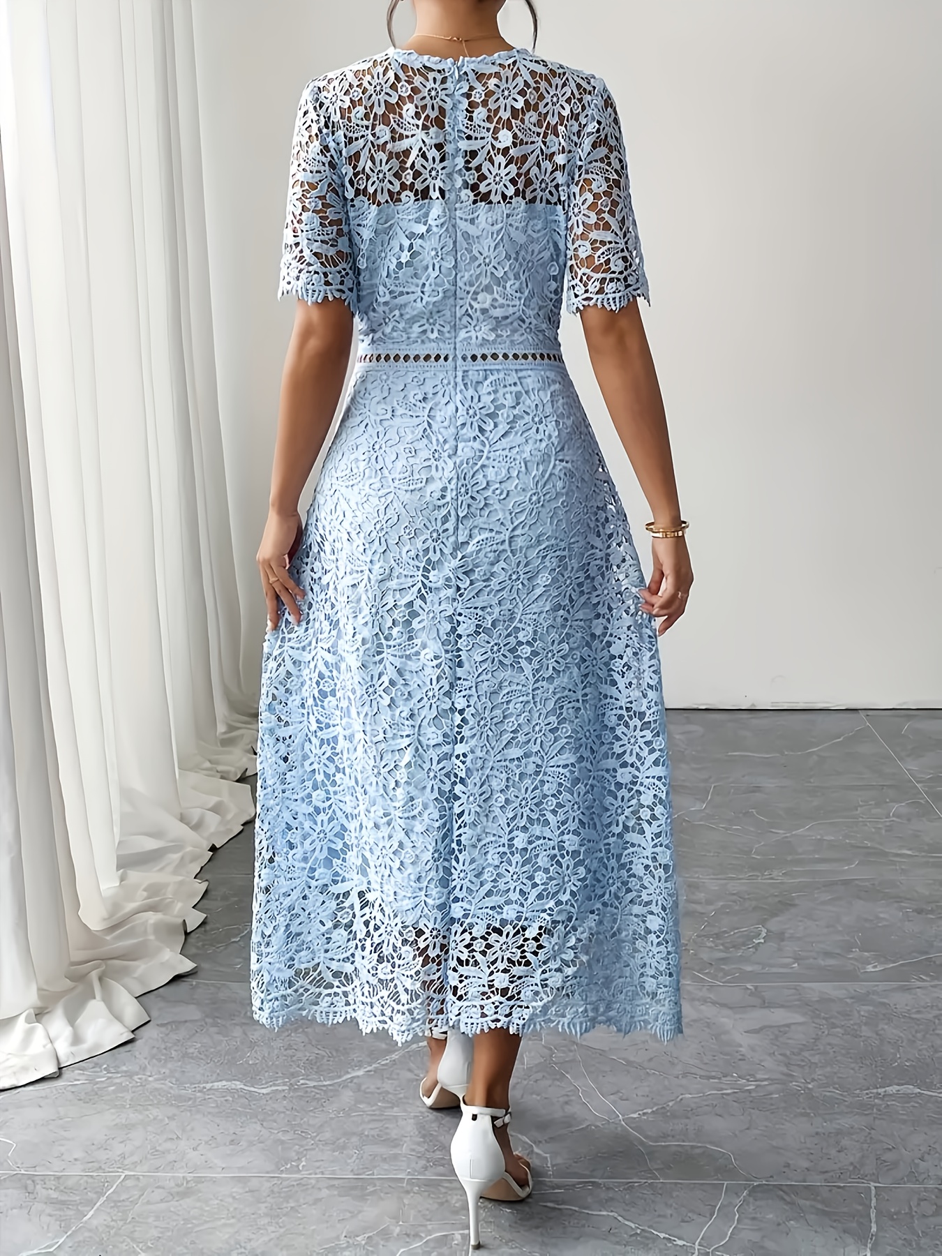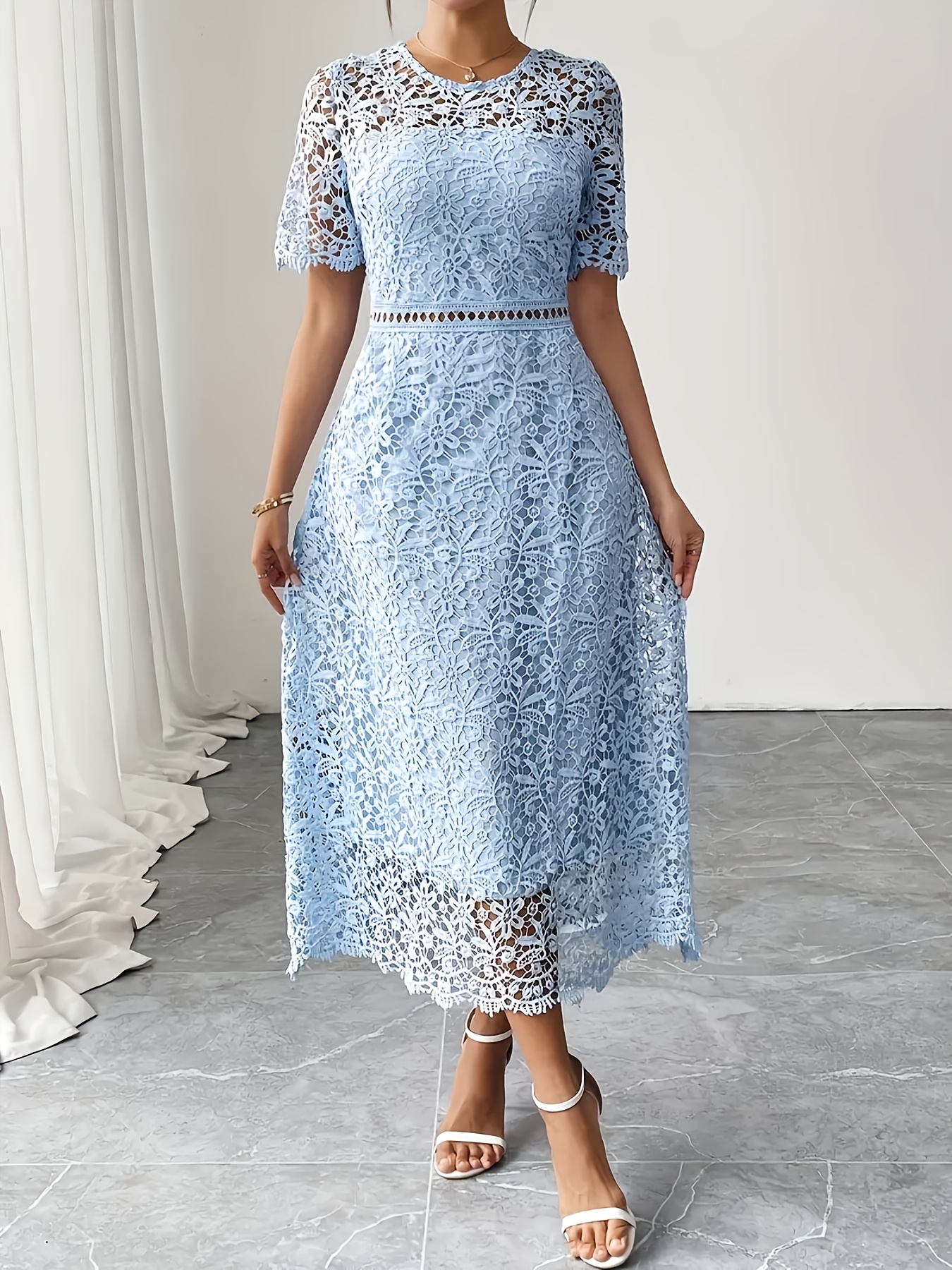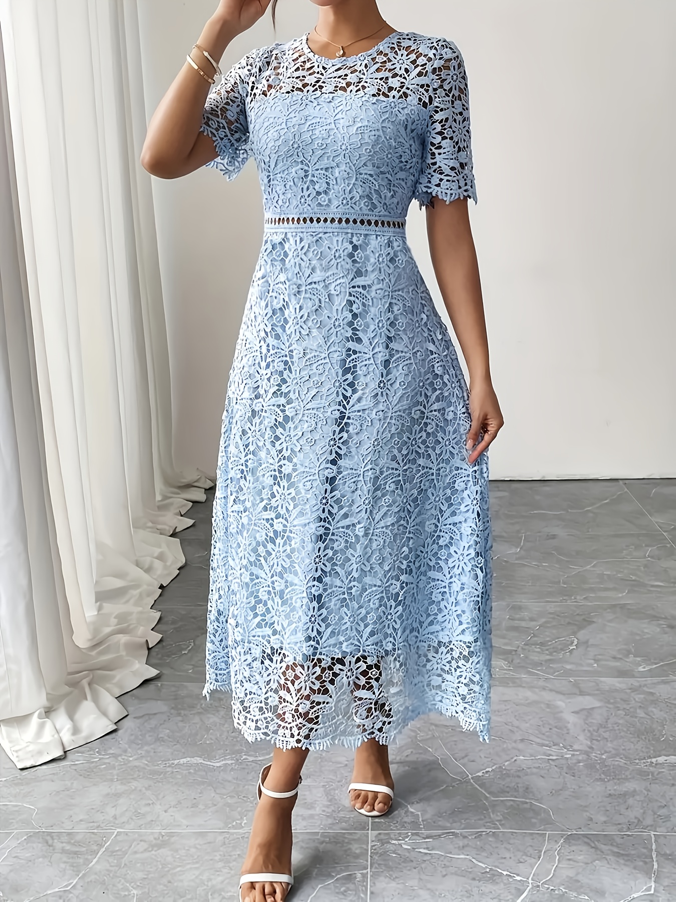 Women'S Elegant Long Formal/semi-formal Dress - Flowy A-Line Party Wedding Guest Gown, Round Neck Short Sleeve Evening Dress for Women, Special Occasion, Feminine Design, Delicate Lace, Lace Detailing, Bridal Guest