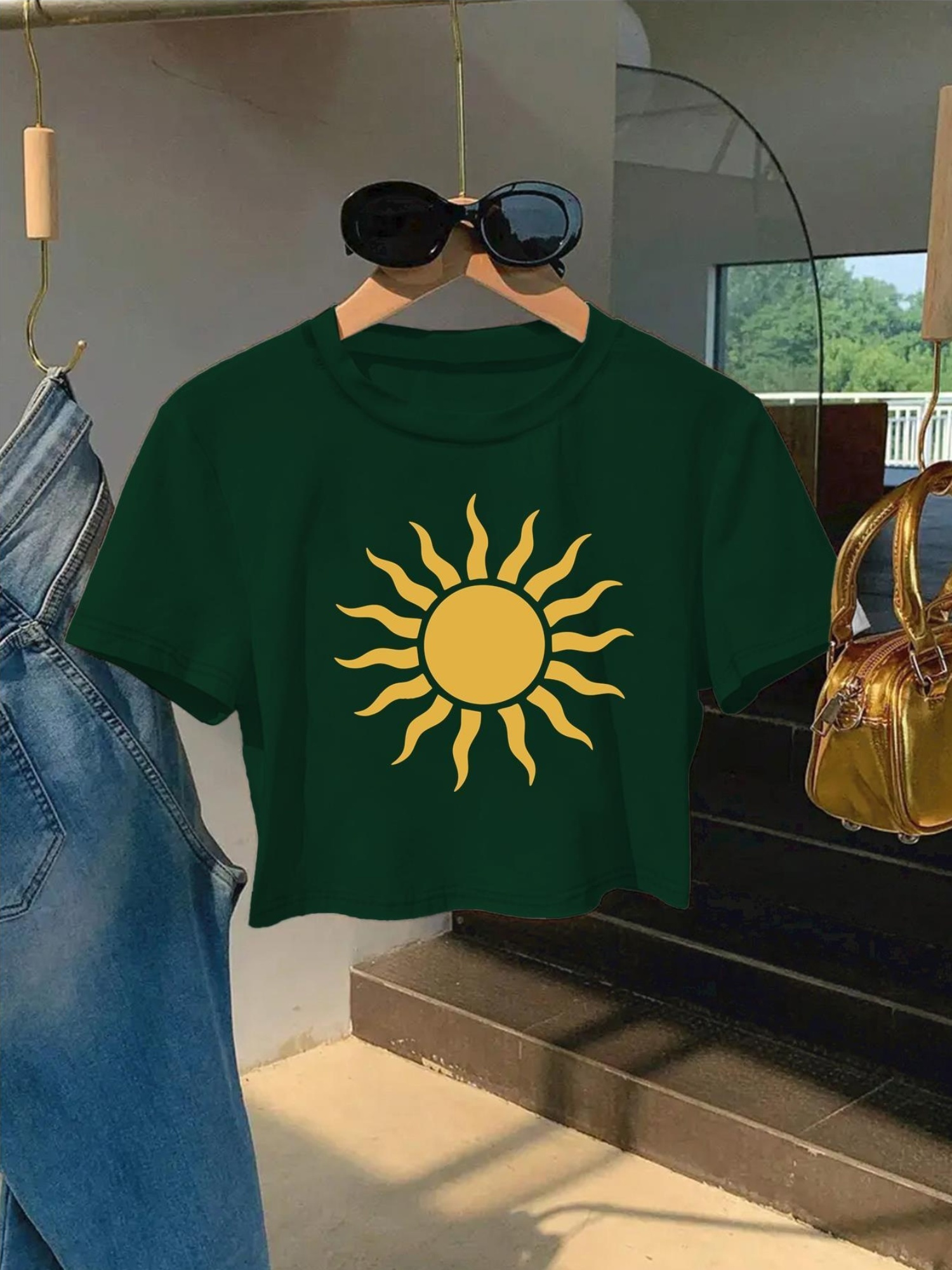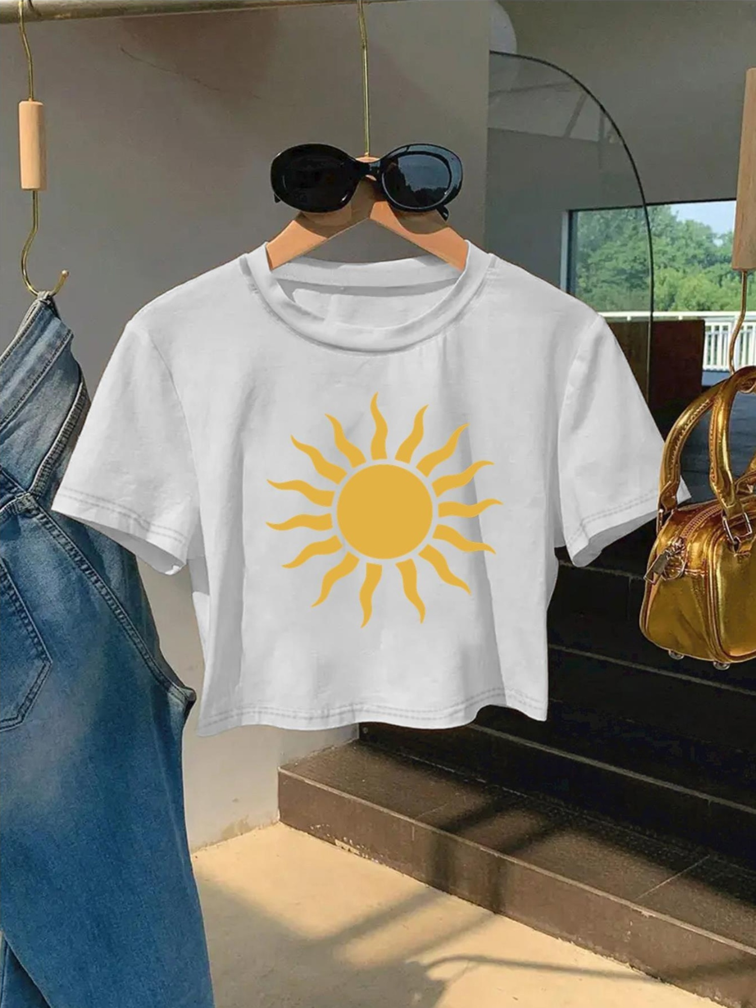 Women'S Vibrant Sun Graphic Crop Top T-Shirt - Casual Round Neck Short Sleeve, Machine Washable, Slim Fit, Perfect for Spring/Summer Outfits, Sunset Shirt