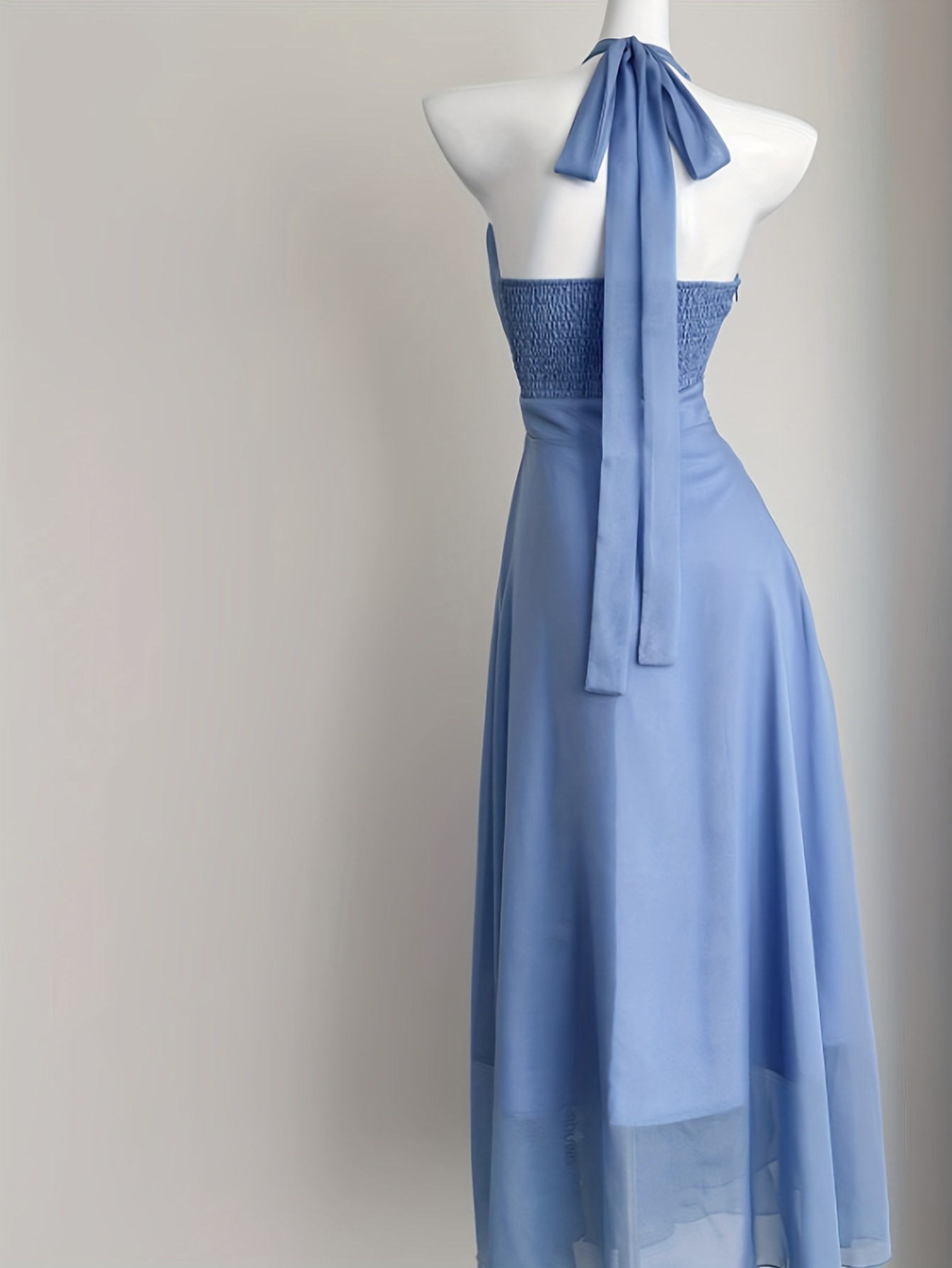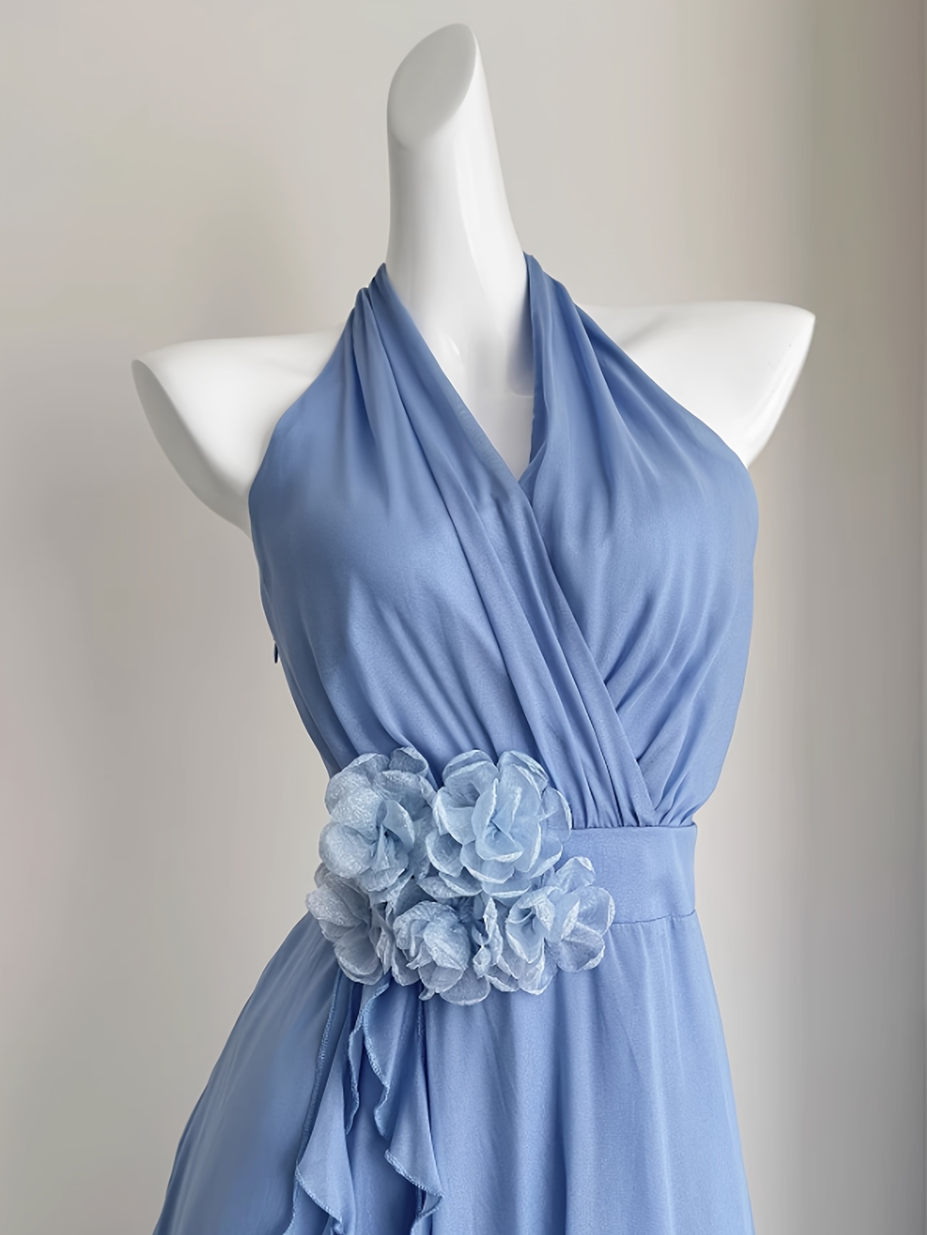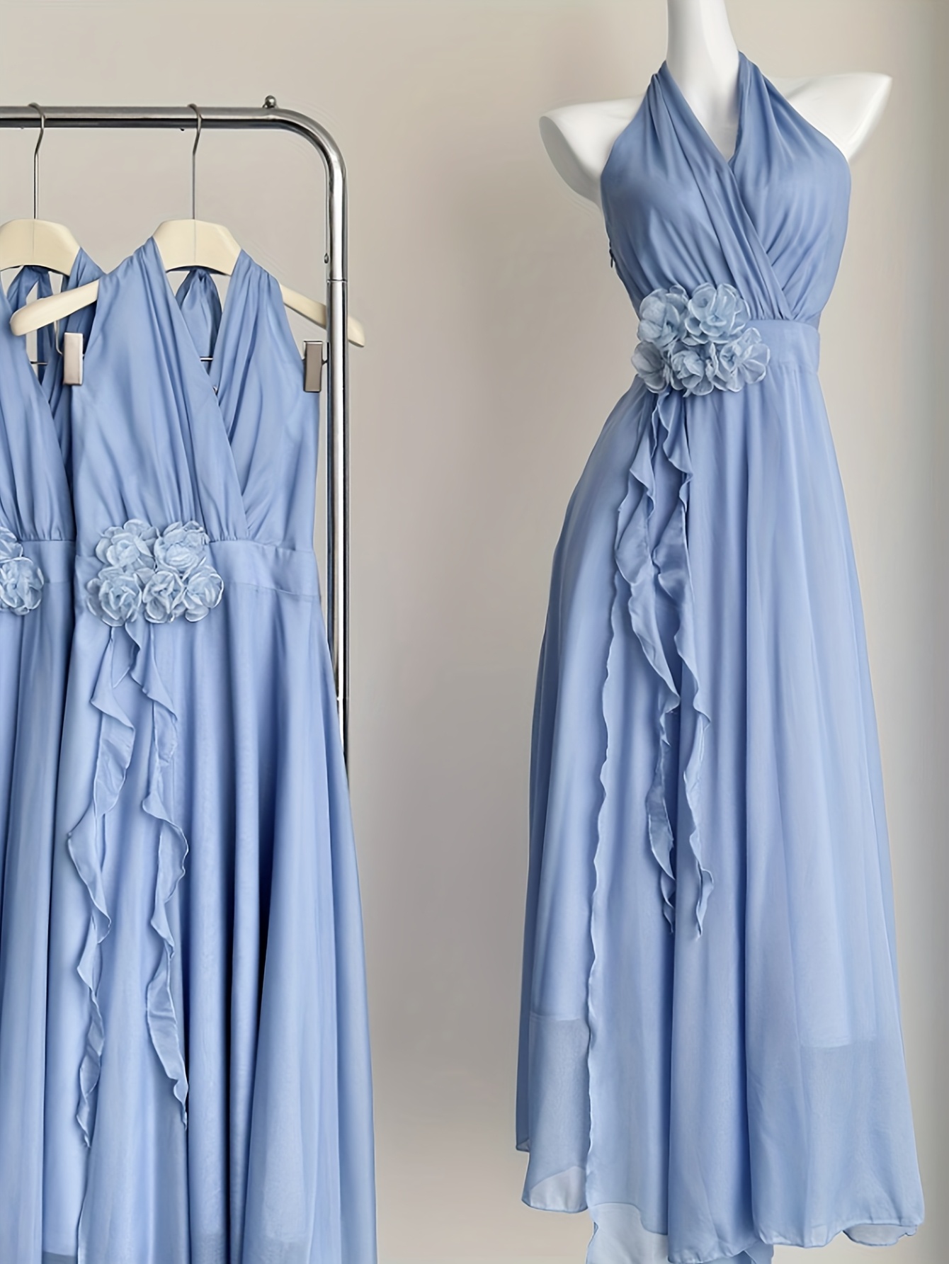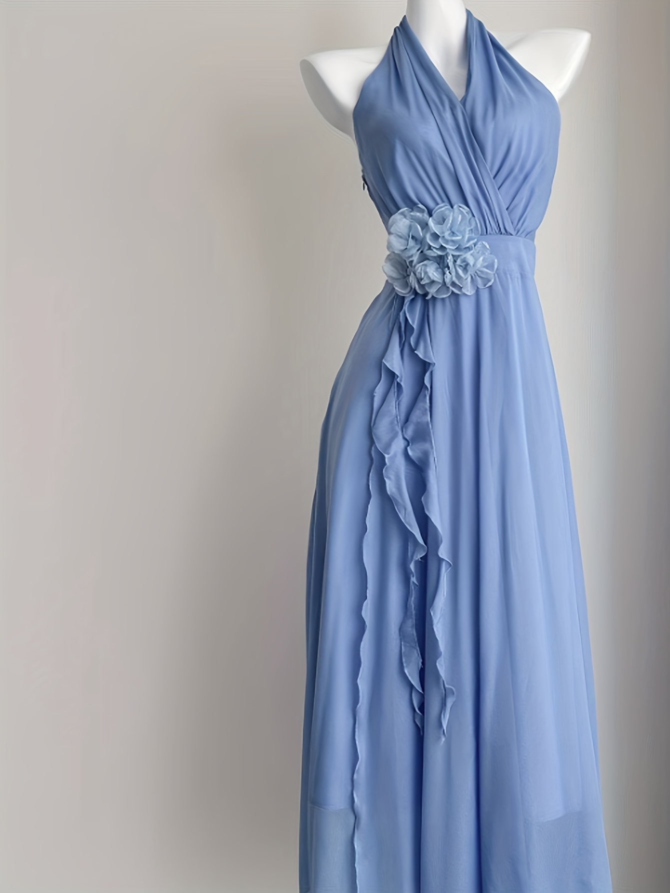 Blue Vacation Style French Floral Waist-Cinched Halter Neck Sleeveless Backless Chiffon Maxi Dress for Women, Summer
