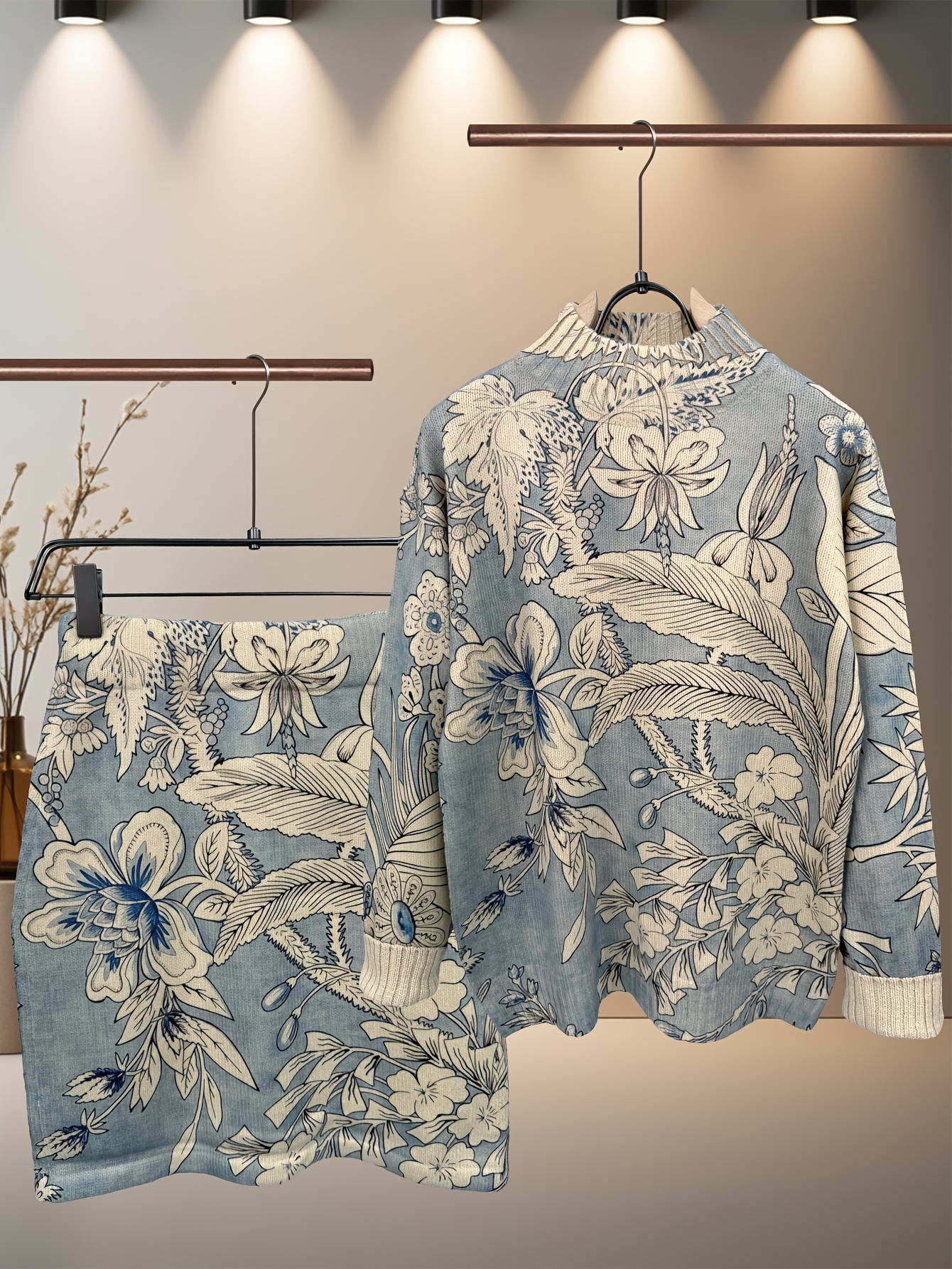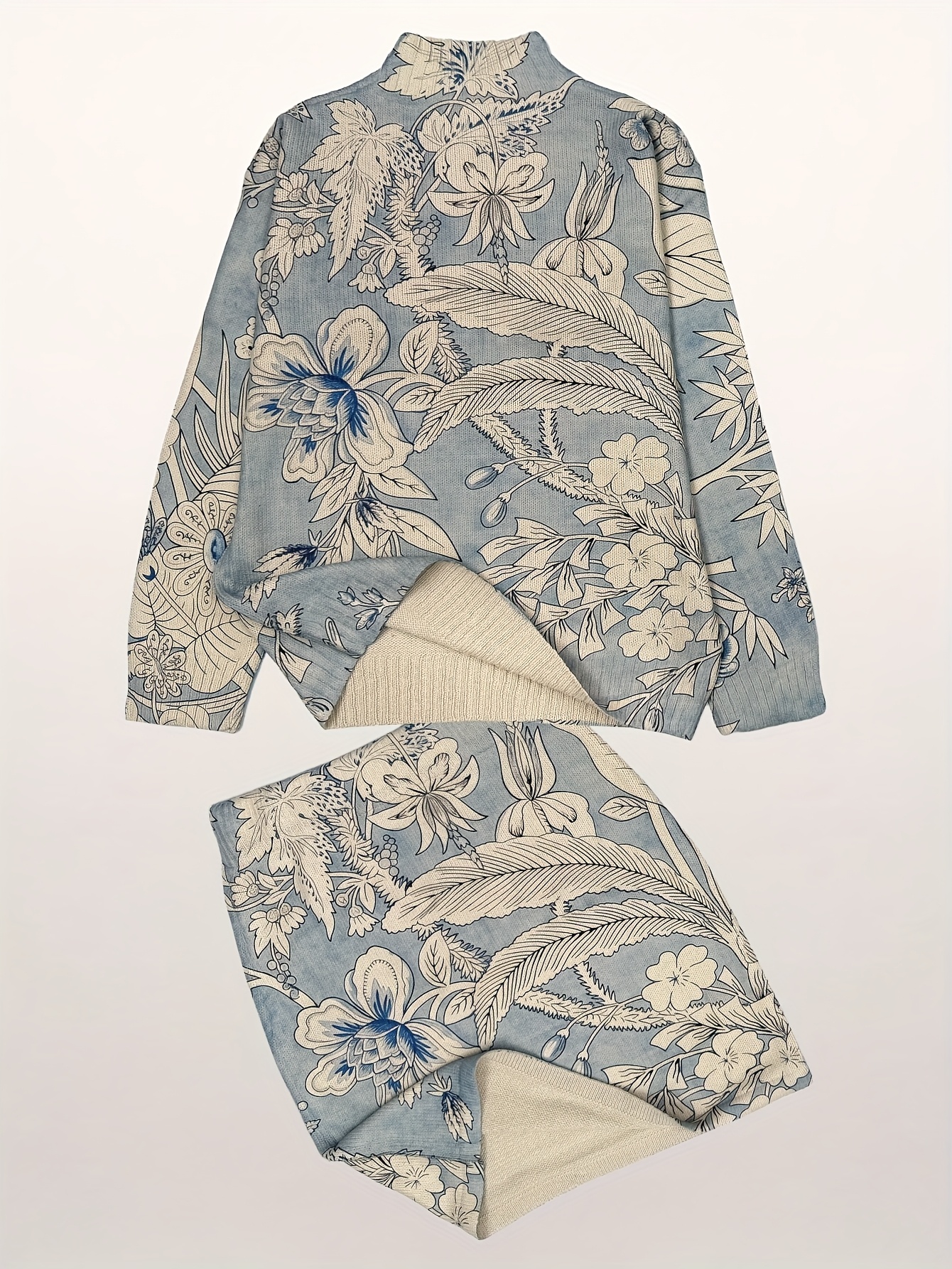 Women's 3D All Over Printed Knitwear Set High Neck Long Sleeve Sweater and Skirt Mid Weight Autumn Winter Outfit Vintage Botanical Pattern Casual Elegant Warm and Comfortable