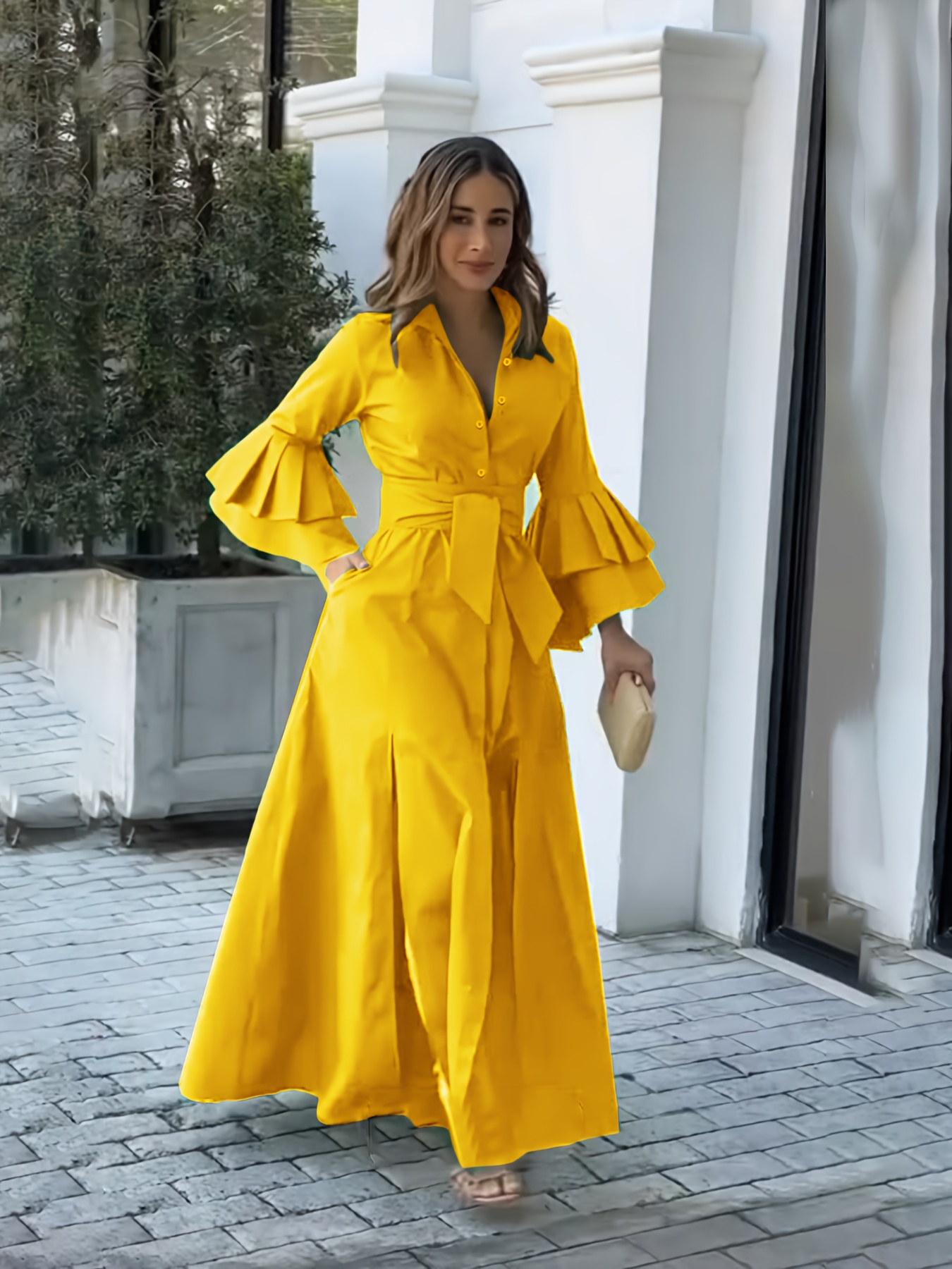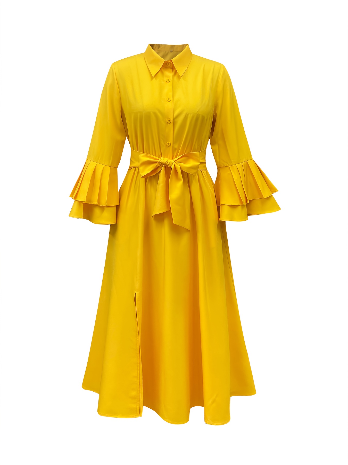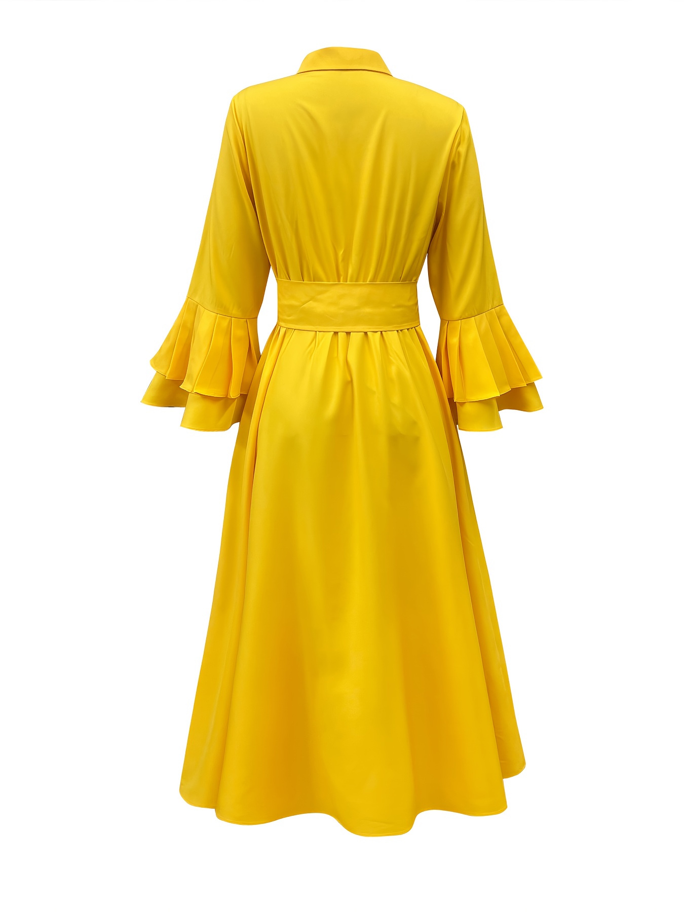 Elegant Yellow Ruffle Sleeve Blouse Dress for Women - Long Sleeve, Button-Up, Tie Waist, A-Line Silhouette, Perfect for Spring & Fall Parties, Party Dress | Ruffle Sleeve Dress | Polyester Fabric