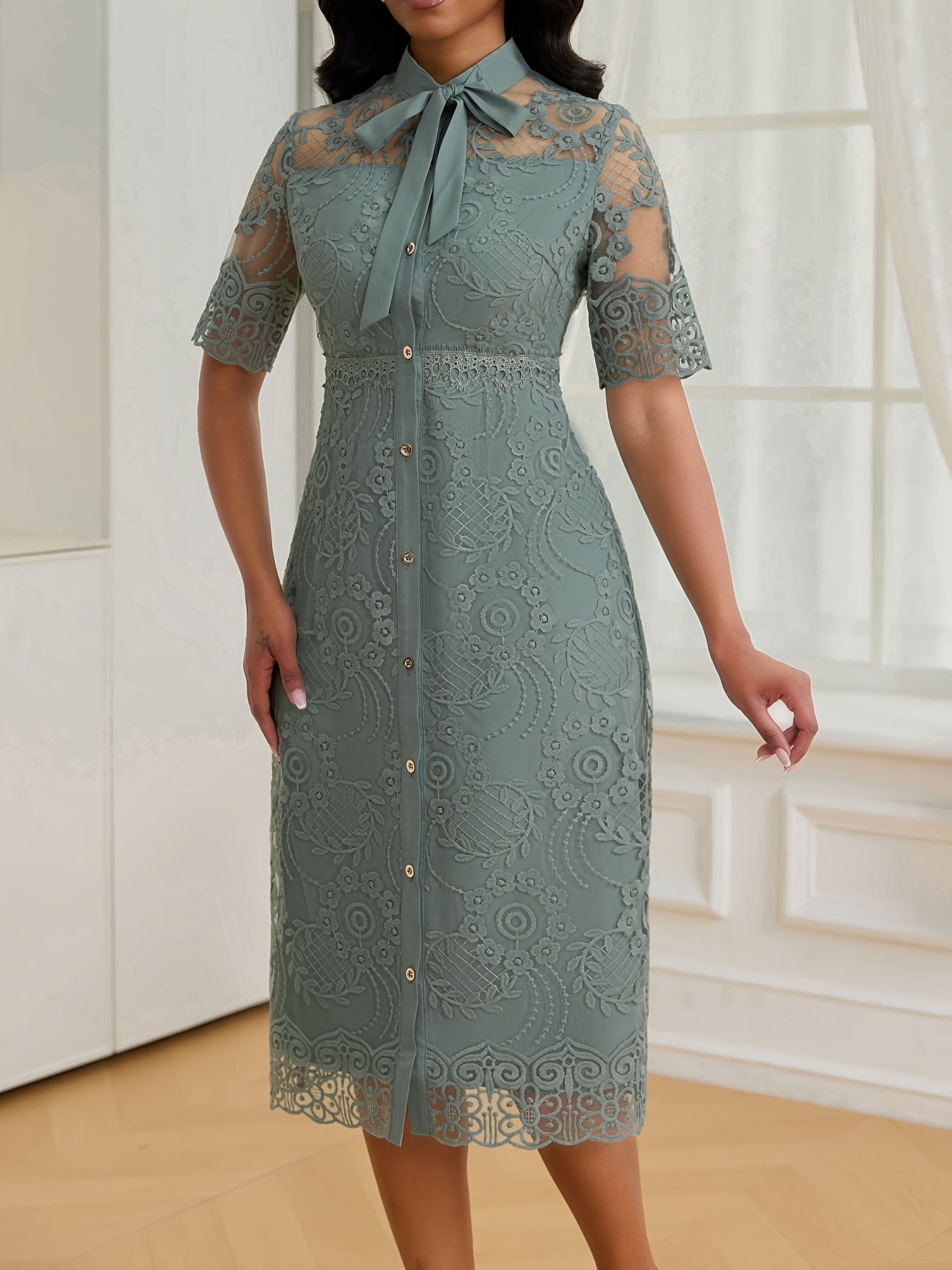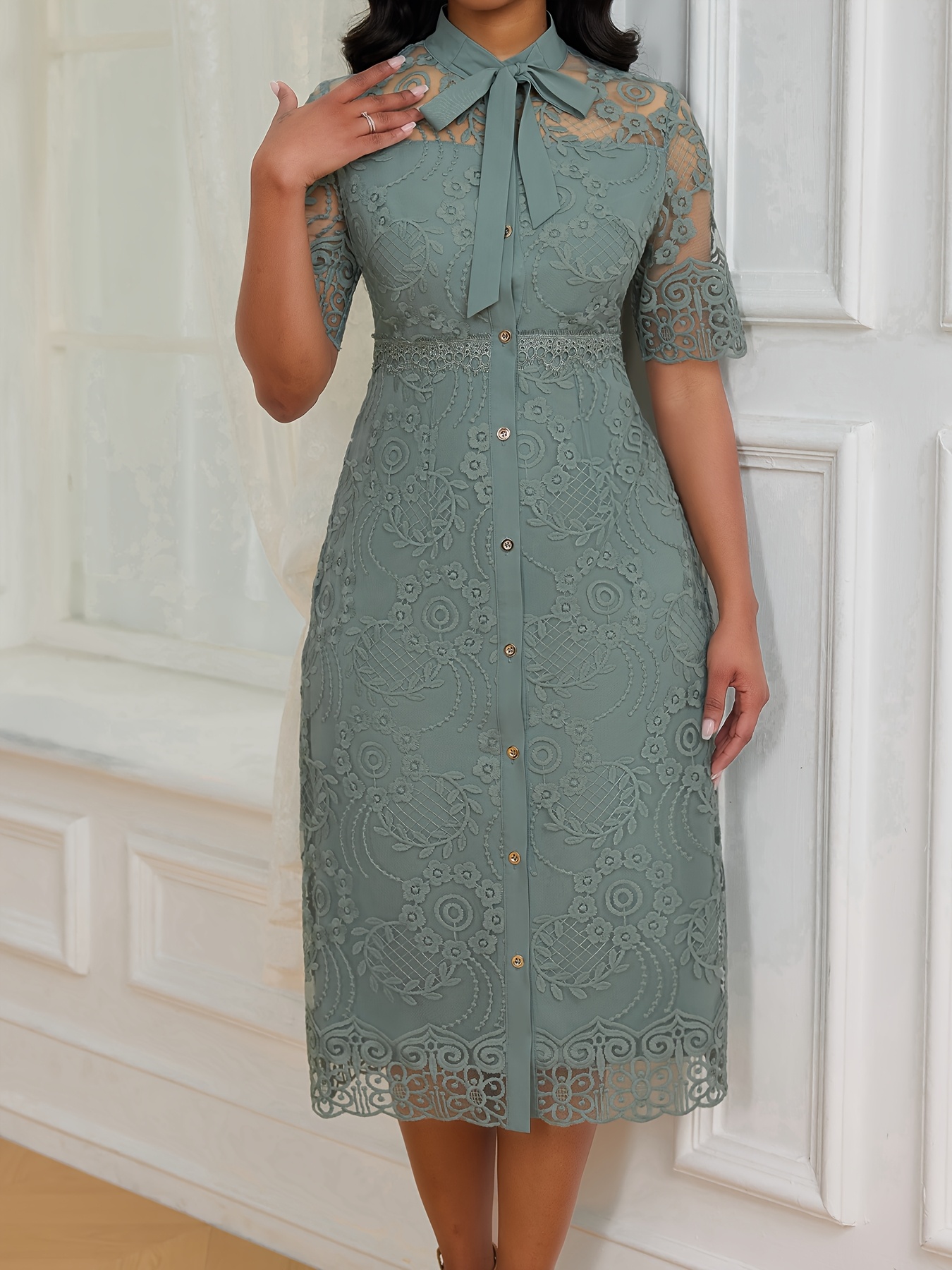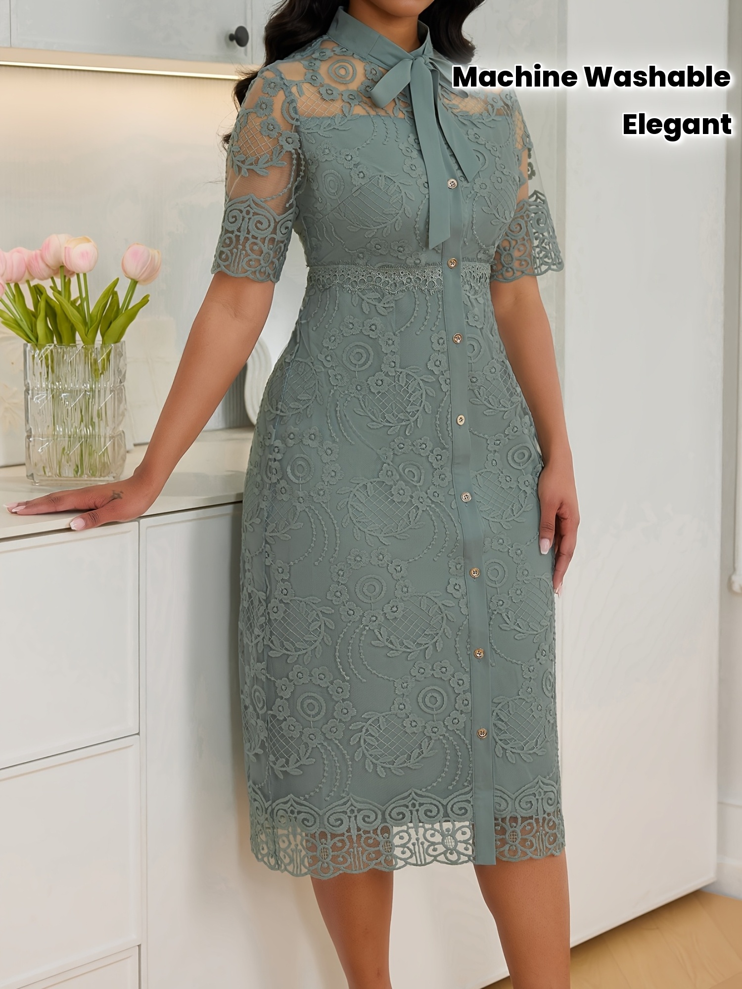Women's Elegant Embroidered Lace Slim-Fit Midi Dress with Lace-Up Front & Short Sleeves - Machine Washable A-Line Silhouette for All-Season Wear, HRYY284
