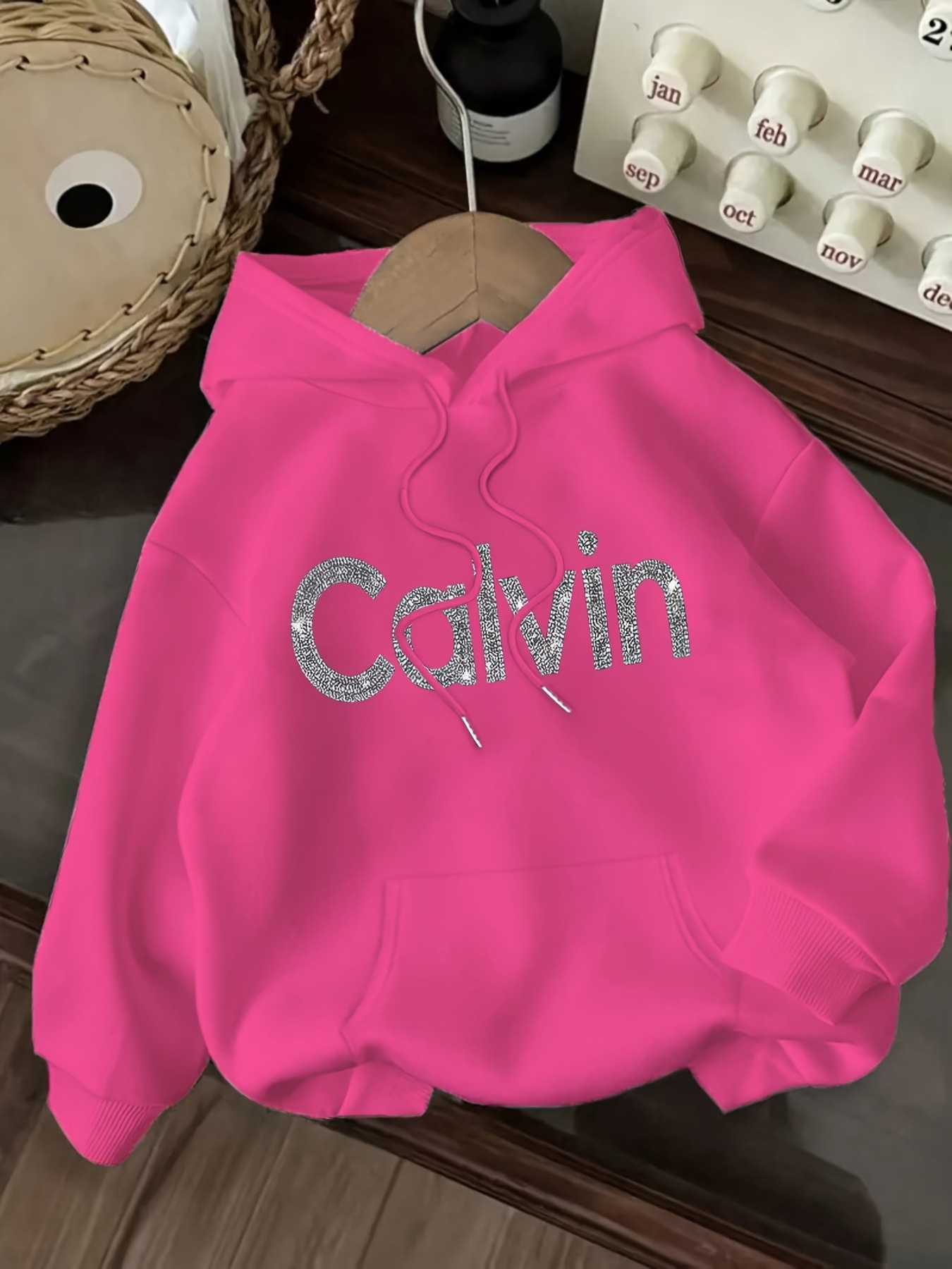 Women's CALVIN Letter Print Hooded Sweatshirt - Oversized Kangaroo Pocket & Drawstring Hood, Cozy Fall Winter Sweater with White CALVIN Logo, Casual Pullover (Machine Washable) for Casual Attire