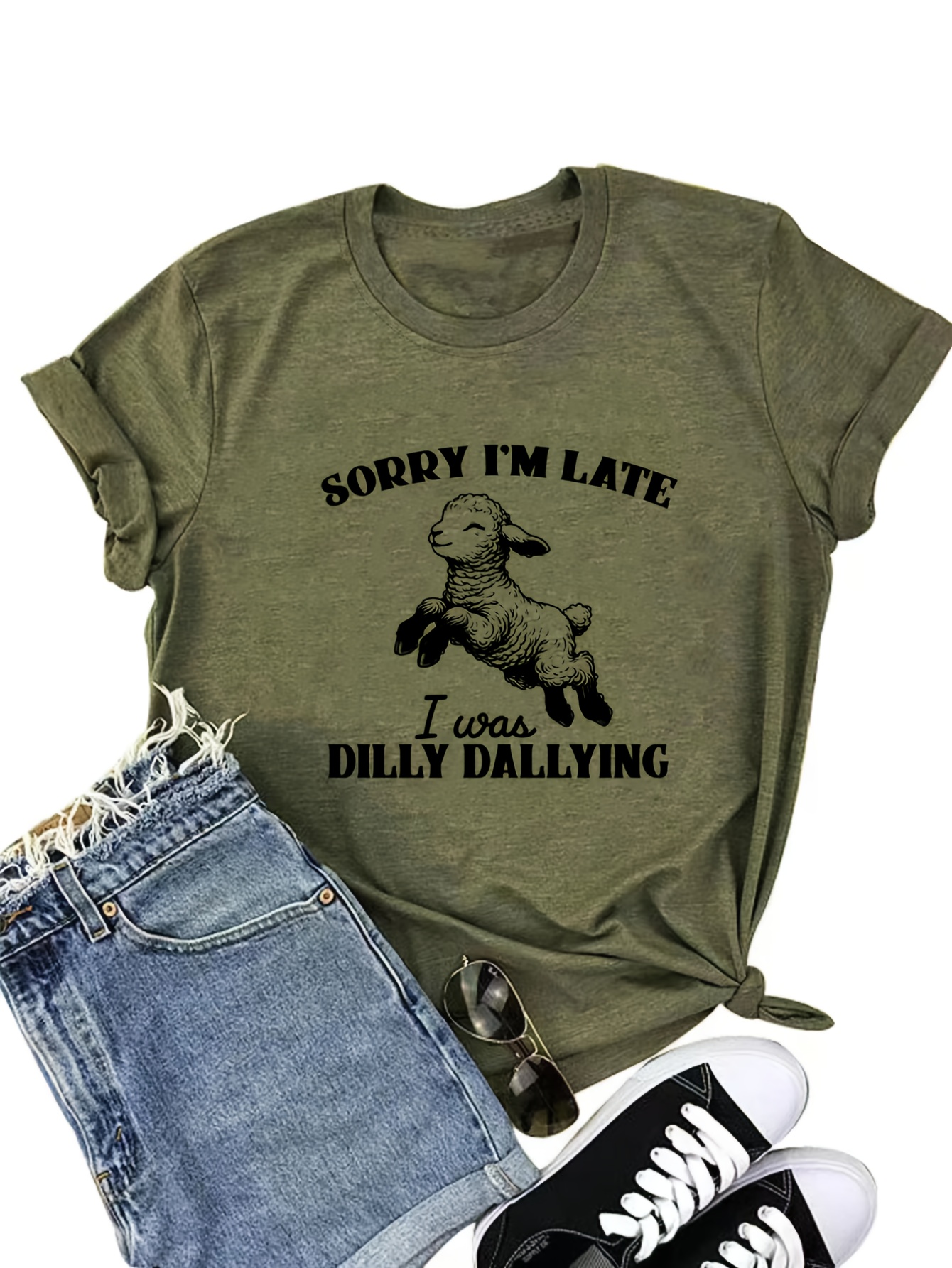 [Funny Sheep | Casual] Olive Green Funny Sheep Print | Women's Casual Crew Neck T-Shirt | 60% Polyester 35% Rayon 5% Spandex Knit Fabric, All-Season Animal Pattern Tee, 180gsm